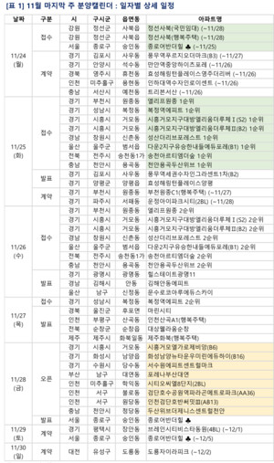 11월 마지막 주에는 전국 9개 단지 총 2802가구(일반분양 2034가구)가 분양을 시작한다. 경기 성남시 복정동 ‘복정역에피트’, 경기 시흥시 거모동 ‘시흥거모지구 대방엘리움더루체Ⅰ·Ⅱ’, 울산시 울주군 범서읍 ‘다운2지구유승한내들에듀포레’ 등에서 청약을 진행한다. 모델하우스는 인천 미추홀구 학익동 ‘시티오씨엘8단지’, 인천 서구 원당동 ‘인천검단호반써밋Ⅲ’, 충남 천안시 청당동 ‘두산위브더제니스센트럴천안’ 등 8곳이 오픈 예정이다. 경기 성남시 복정동 243번지 일원(성남복정1지구 B1블록)에서 ‘복정역에피트’가 청약 접수를
