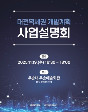 대전시는 오는 19일 오후 4시 30분 우송예술회관에서 대전역세권 개발계획 사업설명회를 개최한다.이번 설명회는 사업 추진 현황과 계획을 공유하는 자리로, 대전시와 ㈜대전역세권개발PFV가 공동으로 주최해 열린다. 이장우 대전시장, ㈜대전역세권개발PFV, 지역의원, 한국철도공사 등 관계기관, 지역 건설업계, 상인연합회, 주민 등 다수가 참석할 예정이다.대전역세권 개발계획은 동구 정동·소제동 일원 92만 3639㎡ 규모의 낙후된 역세권을 주거, 업무, 상업, 숙박이 결합된 복합도시로 조성하는 사업이다. 복합2구역 개발, 충청메가스퀘어 조