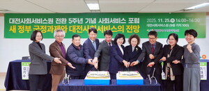 대전사회서비스원(원장 김인식)이 사회서비스원 전환 5주년을 맞이해 25일 ‘새 정부 국정과제와 대전 사회서비스의 전망’을 주제로 포럼을 개최했다.이번 포럼은 지난 5년간의 성과를 공유하고, 새 정부 국정과제인 ‘통합 돌봄’에 발맞춰 혁신 비전과 전략을 찾기 위해 추진됐다. 포럼에는 학계, 복지계, 정책 전문가 등 150여 명이 참석했다.포럼은 최성아 대전시 정무경제과학부시장과 김현채 대전시사회복지협회장의 축사로 시작됐다. 이어 박세경 한국보건사회연구원 부원장이 ‘AI 복지·돌봄 혁신의 기회와 도전: 관계중심의 서비스 원칙을 세우다’