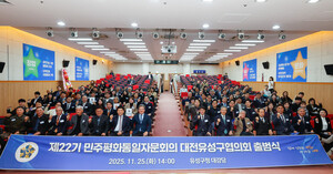민주평화통일자문회의(이하 민주평통) 대전유성구협의회가 25일 구청 대강당에서 ‘제22기 출범식 및 2025년 3차 정기회의’를 개최했다.이날 행사는 출범식, 개회식, 자문위원 선서, 정기회의 등의 순으로 진행됐다. 민주평통 의장인 대통령을 대신해 정용래 유성구청장이 제22기 자문위원에게 위촉장을 수여했다.민주평통 대전유성구협의회는 (주)대원티앤에이 대표인 이상욱 협의회장을 비롯해 지역대표 18명과 직능대표 96명 등 총 115명으로 구성됐다. 이들은 임기 2년 동안 평화통일 기반 조성을 위한 활동을 수행할 예정이다.또 민주평통 대전