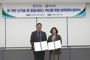 대전도시공사(사장 정국영)가 한국전자통신연구원(원장 방승찬)과 ‘AI 기반 신기술·공공서비스 혁신을 위한 업무협약’ 을 체결했다.이번 협약은 기술협력·자문, AI 활용 등 양 기관의 공동발전을 위해 추진됐다. 주요 협약 내용은 ▲ AI 활용 공공서비스 혁신 추진 ▲ AI 기반 도시재생, 환경, 신재생에너지 사업 협력 ▲ 도시환경의 안전, 치안 등을 위한 기술자문 ▲ 개발 기술의 실증을 위한 인프라 활용 등이다.이날 협약식에는 대전도시공사 정해교 경영본부장, 한국전자통신연구원 김정녀 사이버보안본부장이 참석했다.정해교 대전도시공사 경영