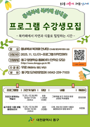 대전 동구 ‘동네북네 북카페 산내점’에서 북카페 프로그램 수강생을 모집한다.이번 프로그램은 오는 20일부터 내달 18일까지 운영된다. 산내동의 지역 특화 주제인 원예와 자연을 중심으로 ▲자연과 함께하는 책놀이(초등 1~3학년 대상) ▲슬기로운 식물생활, 플랜테리어(성인 대상) 등 2개 과정이 진행된다.신청은 12일부터 프로그램 시작 전까지 선착순으로 가능하다. 홍보문 내 정보무늬(QR코드) 또는 동구 평생학습 누리집을 통해 접수할 수 있다. 수강료는 무료(재료비 별도)이며, 자세한 사항은 동구청 도서관운영과로 문의하면 된다.박희조