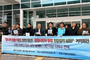 대전의 민주·진보·개혁 인사들이 연합정치 실현과 선거제 개편을 통한 정치개혁을 촉구했다. 내년 치러지는 지방선거에서 광역·기초의회 다양성을 보장해 지역에 산재한 내란세력을 청산해야 한다고 주장했다. 대전시국회의는 25일 대전시의회에서 기자회견을 열어 “지난 20대 대선 선거 승리는 광장에 모인 시민이 일궈낸 승리지만, 진정한 내란 청산이 이뤄지지 않는 한 온전한 승리라고 할 수 없다”고 말했다. 시국회의는 “검찰이 선택적 집단 반발에 나서고 있으며, 조희대 사법부가 보이는 행태 역시 역사적 책임과 정의 실현을 거스르는 또 다른 내란
