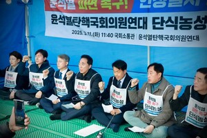 더불어민주당과 조국혁신당, 진보당, 사회민주당 등 야권 의원으로 구성된 ‘윤석열 탄핵 국회의원 연대’가 11일 윤 대통령 ‘조기 탄핵’을 촉구하며 단식·삭발 투쟁에 나섰다. 이들은 윤 대통령 구속 취소 결정을 포기한 심우정 검찰총장 즉각 사퇴와 법원의 윤 대통령 직권 재구속, 국민의힘 정당 해산을 요구했다. ‘윤석열 탄핵 국회의원 연대’는 이날 국회 소통관서 기자회견을 열어 “오늘로 12·3 내란 98일째를 맞는다. 더는 지체할 수 없다”며 “윤석열 탄핵 국회의원 연대는 헌법재판소의 신속하고 단호한 윤석열 탄핵 인용을 촉구하며 단식