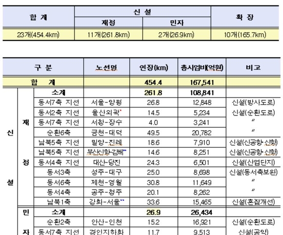 도로 건설에 국고 10조 원을 포함해 총 28조9000억 원(계속사업 21조 5000억 원, 신규사업 7조 4000억 원이 투입된다.