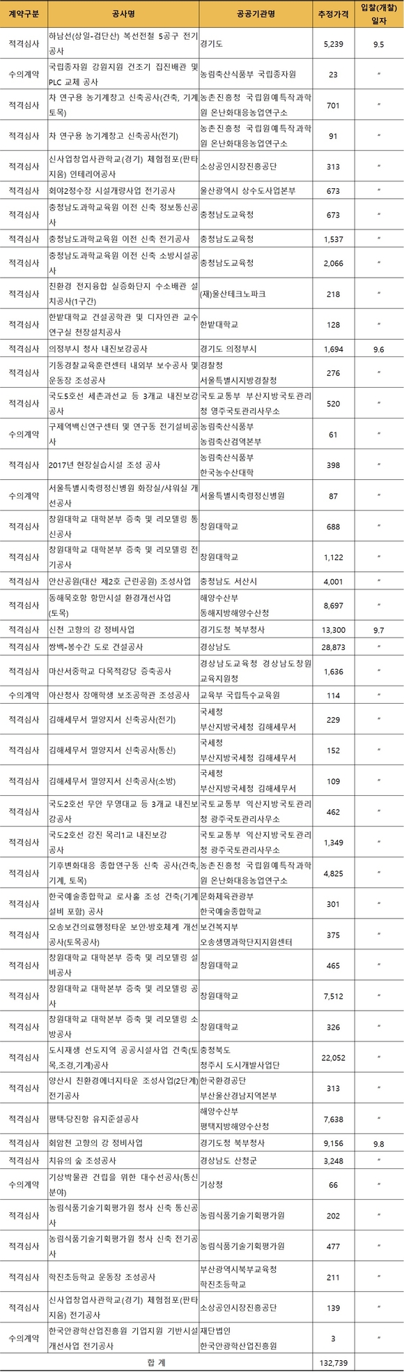 규모별 발주량을 보면 이 기간의 집행예정 공사 중 금액기준으로 300억 원 이상 대형공사는 없고, 적격심사(1324억 원)와 수의계약(3억 원)으로 집행될 예정이다.