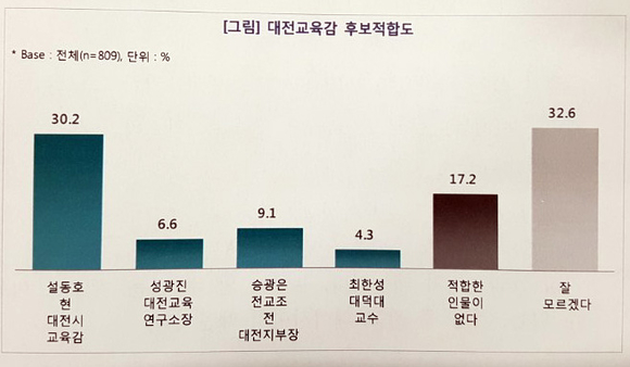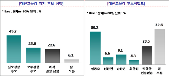 이런 후보들에 대한 지지 성향은 실제 후보 적합도 면에서 큰 차이를 보인다. 현역이면서도 보수성향인 설동호 대전교육감이 30.2%로 가장 적합한 것으로 조사됐기 때문이다. 진보 후보를 자청하고 있는 승광은 전 전교조 대전지부장이 9.1%였으며, 성광진 대전교육연구소장(6.6%)과 최한성 대덕대 교수(4.3%)가 뒤를 이었다. 적합한 인물이 없다는 대답이 17.2%로 조사된 가운데 무응답이 무려 32.6%에 달했다.