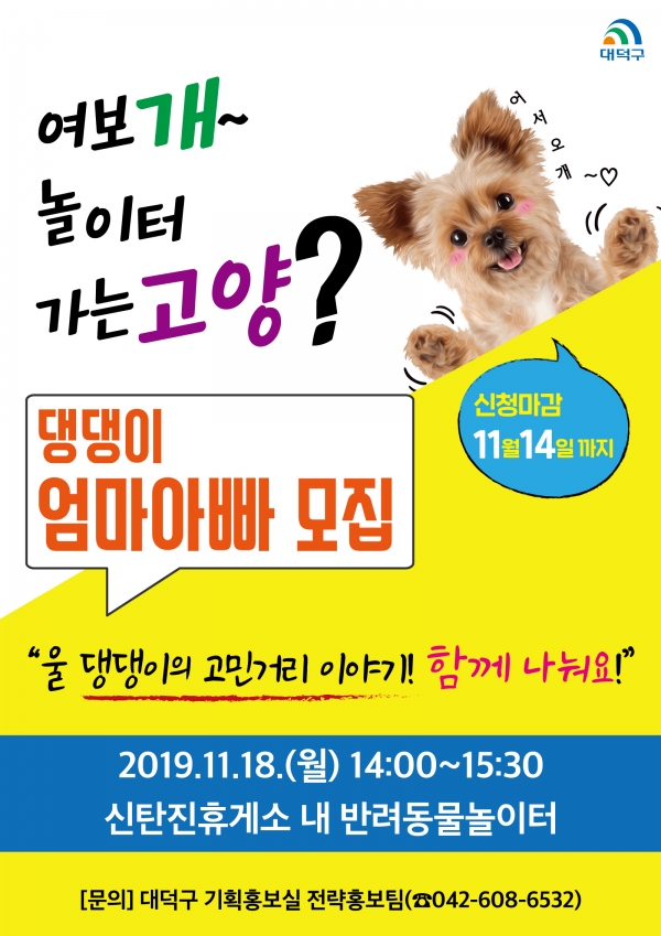 대덕구가 오는 18일 신탄진휴게소 내 반려동물놀이터(상서동 377번지 일원)에서 반려동물을 키우는 주민과 함께하는 ‘걱정말아요 대덕’ 토크콘서트를 연다.