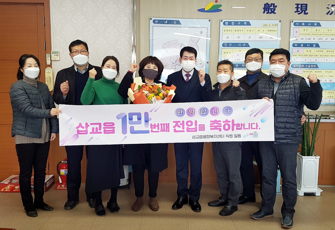 22일 군에 따르면, 삽교읍은 지난 1월 27일 내포신도시로 전입한 1만번 째 전입자에게 꽃다발을 증정하고 기념촬영을 하는 등 환영식을 진행했다.