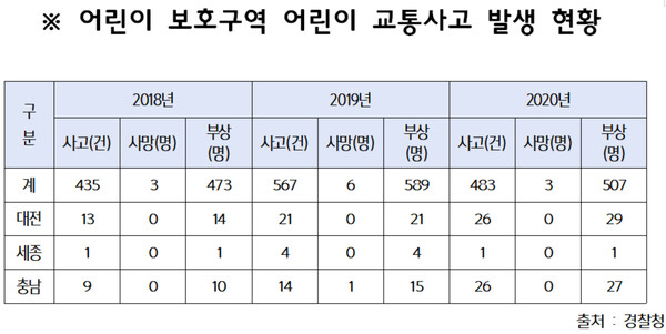 반면 어린이교통사고는 크게 늘었다. 대전은 2018년 13건, 2019년 21건, 2020년 26건으로 3년간 2배 수준으로 증가했으며, 충남은 2018년 9건, 2019년 14건(사망1건), 2020년 26건으로 3배 가까이 늘어났다.