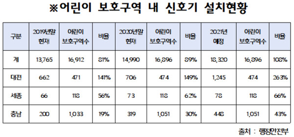 신호기도 늘었다. 다만 지역 간 편차를 보이고 있다. 대전은 2019년 말 662개(141%)에서 2020년말 706개(149%)로 늘었고, 2021년 말까지 1245개(263%)를 설치할 예정이다.
