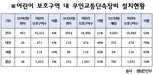 과속카메라의 경우, 대전은 2018년 28개(6%)에서 법 시행 뒤인 2020년 말 219개(46%)로 늘었고, 올해까지 372개(78%)를 설치할 계획이다.