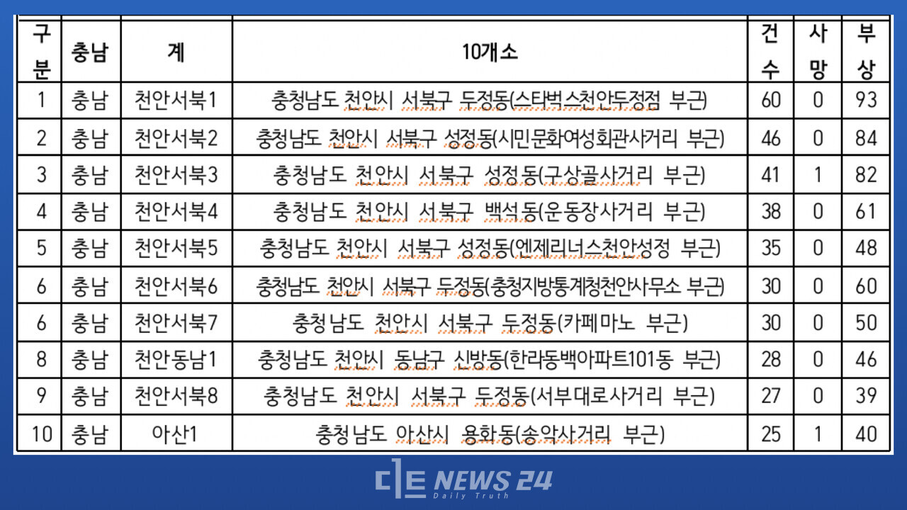 충남도내 음주운전 사고 다발지역을 보면 ▲천안 서북구 두정동 스타벅스천안두정점 인근(60건, 부상 93명) ▲천안 서북구 성정동 시민문화여성회관사거리 인근(46건, 부상 84명) ▲천안 서북구 성정동 구상골사거리(41건, 사망 1명, 부상 82명) ▲천안 서북구 백석동 운동장사거리 인근(38건, 부상 61명) ▲천안 서북구 성정동 엔제리너스천안성정 인근(35건, 부상 48명) ▲천안 서북구 두정동 충청지방통계청 천안사무소 인근(30건, 부상 60명) ▲천안 서북구 두정동 카페마노 인근(28건, 부상46명) ▲천안 동남구 신방동 한라동백아파트 인근(28건, 부상 46명) ▲천안 서북구 두정동 서부대로사거리 인근(27건, 부상 39명) ▲아산시 용화동 송악사거리(25명, 사망 1명, 부상 40명)이다.