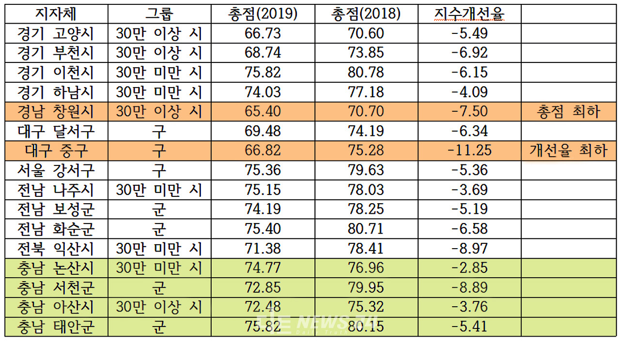 총점이 가장 낮은 곳은 경남 창원시(65.4점)였으며, 개선율 최하위는 대구 중구(–11.25%)였다.