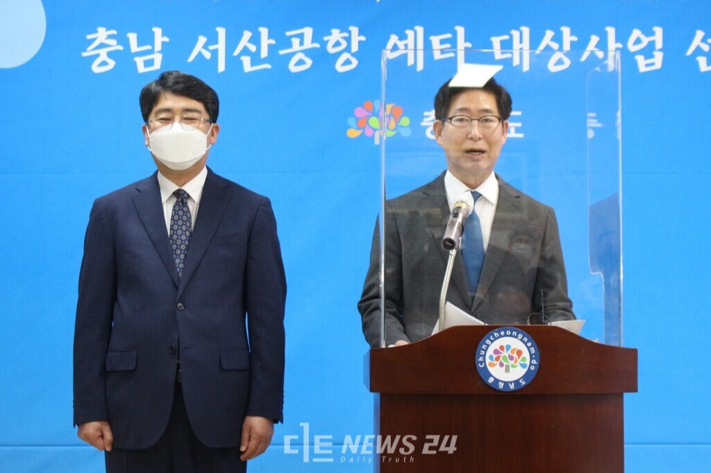 양승조 충남지사와 맹정호 서산시장은 3일 충남역사문화연구원 소회의실에서 기자회견을 열어 “기재부 재정사업평가위원회에서 충남공항이 3분기 예비 타당성 조사 대상 사업에 최종 선정됐다”고 밝혔다.