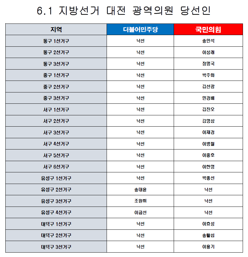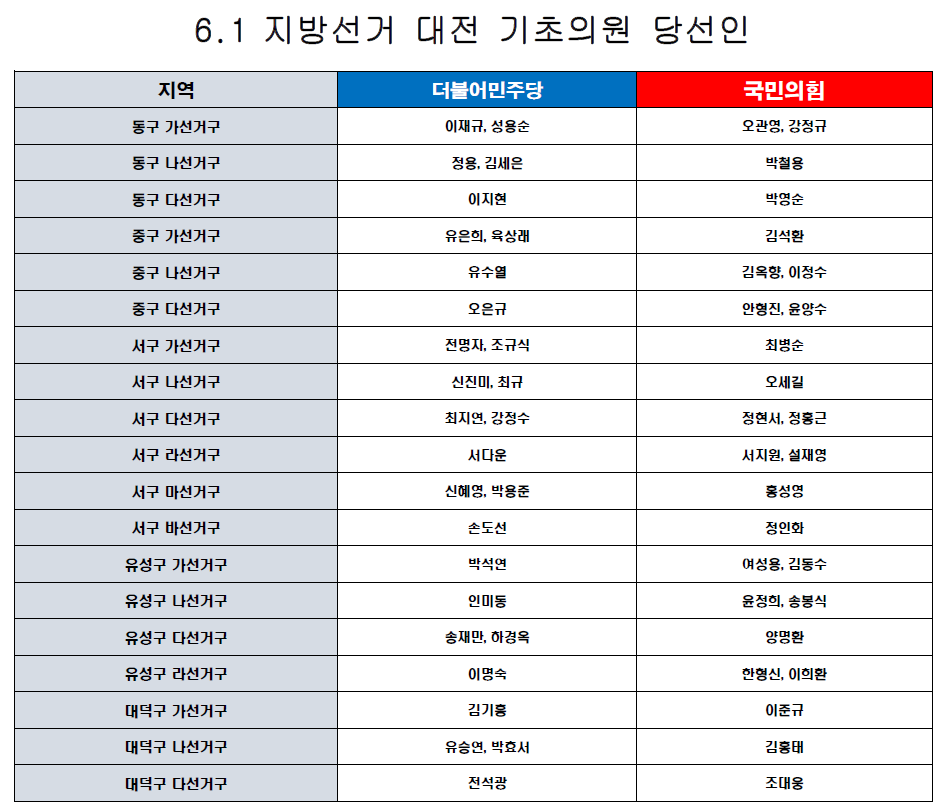 다음은 이번 6·1지방선거 대전 광역·기초의회 당선인 명단.