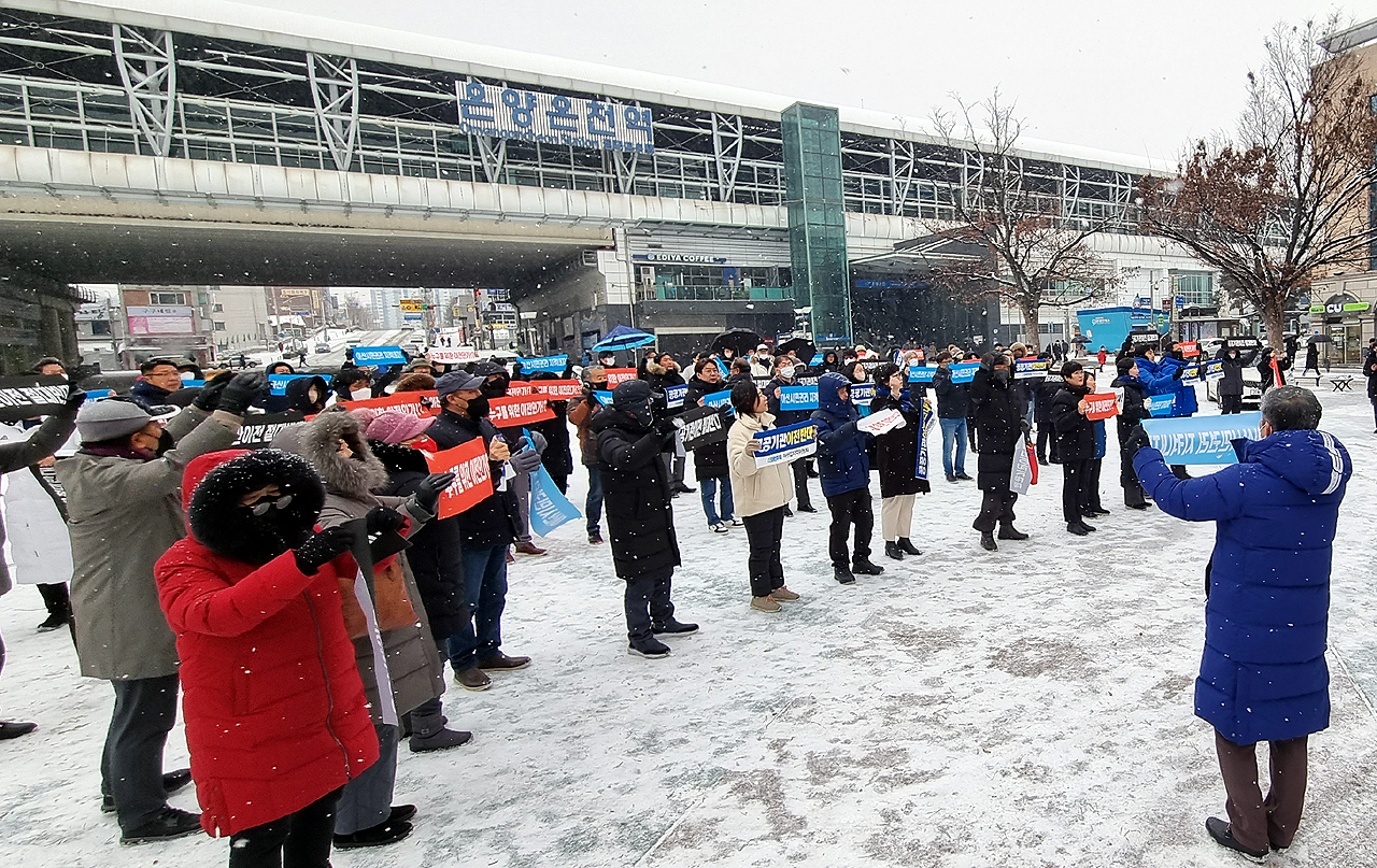 [아산=안성원 기자] 더불어민주당 아산지역 도·시의원들과 시민들이 26일 온양온천역 광장에서 충남도의 ‘공공기관 이전 반대 범시민대회’를 개최했다. (본보 21일자 아산시 공공기관 이전 논란, 다가오는 ‘대화의 시간’ 보도 등)