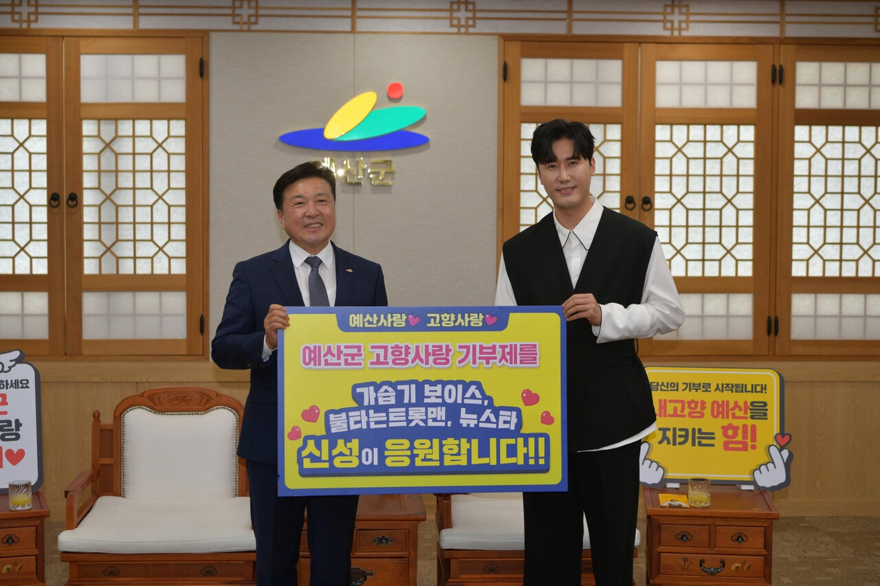 특히 이날 군을 방문한 가수 신성은 예산군에 고향사랑 기부금을 기탁하고 고향사랑기부제 응원 메시지를 전해 눈길을 끌었다.