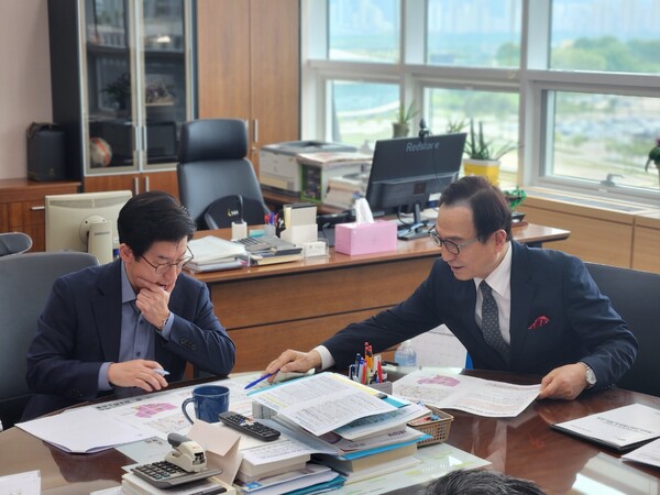 [천안=윤원중 기자] 박상돈 천안시장이 12일 천안 미래모빌리티 국가산업단지 내 70% 이상을 산업시설용지로 확보하기 위해 기획재정부를 방문하고 최상대 제2차관과 면담을 진행했다.