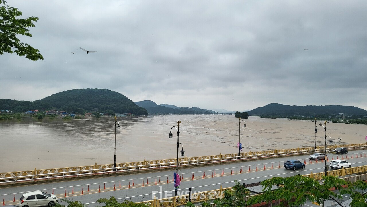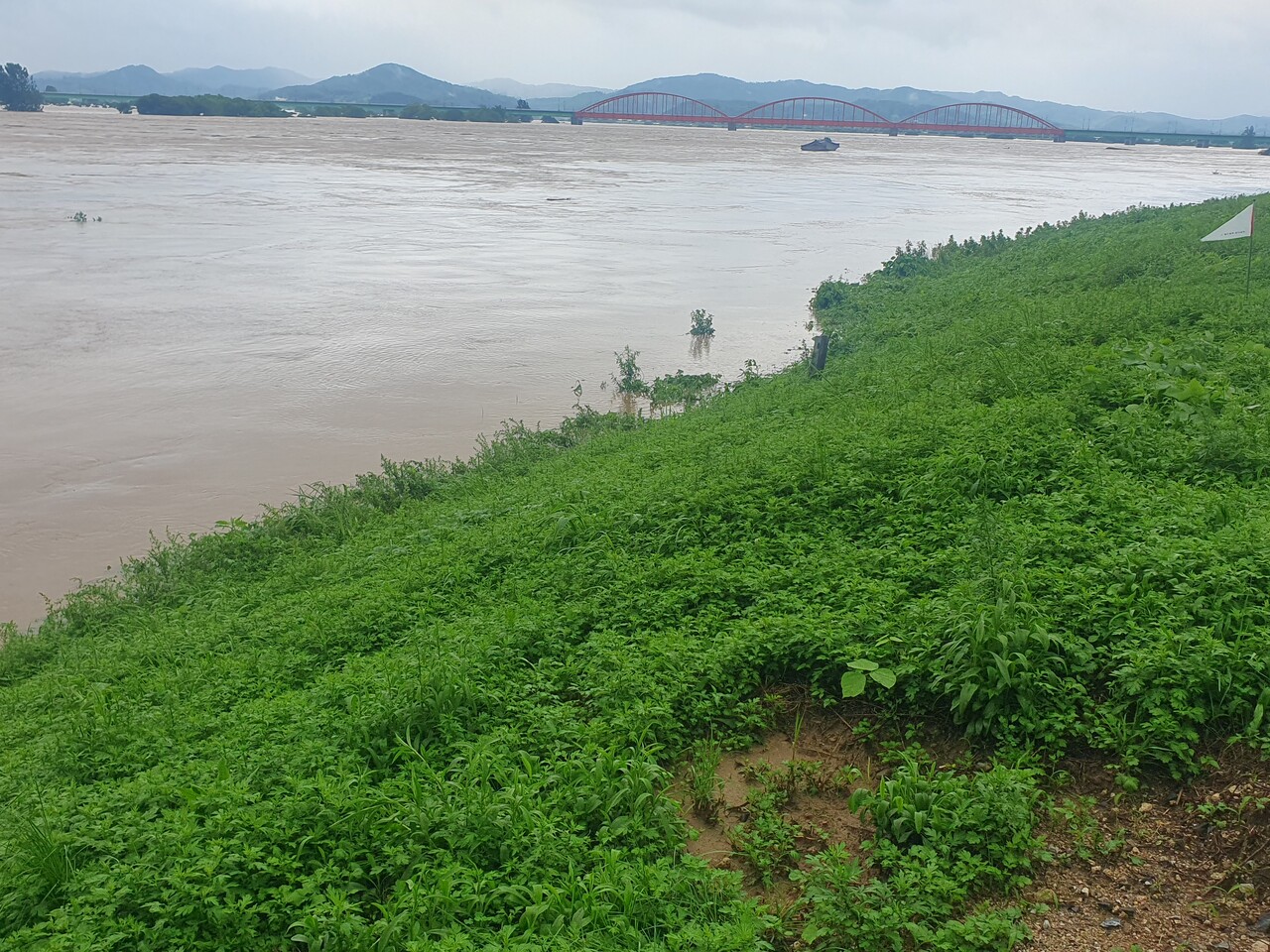 제방을 사이에 두고 강과 마을 진입 도로가 위치해 있는데 도로변에 물이 차올랐기 때문이다.