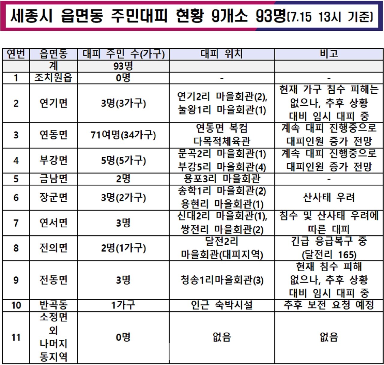 금강과 인접한 연동면이 34가구에 걸쳐 약 71명 대피로 최대치를 기록하고 있고, 부강면과 연기면, 장군면, 연서면, 전의면, 전동면 등 면지역을 중심으로 주민들의 대피가 늘고 있다.