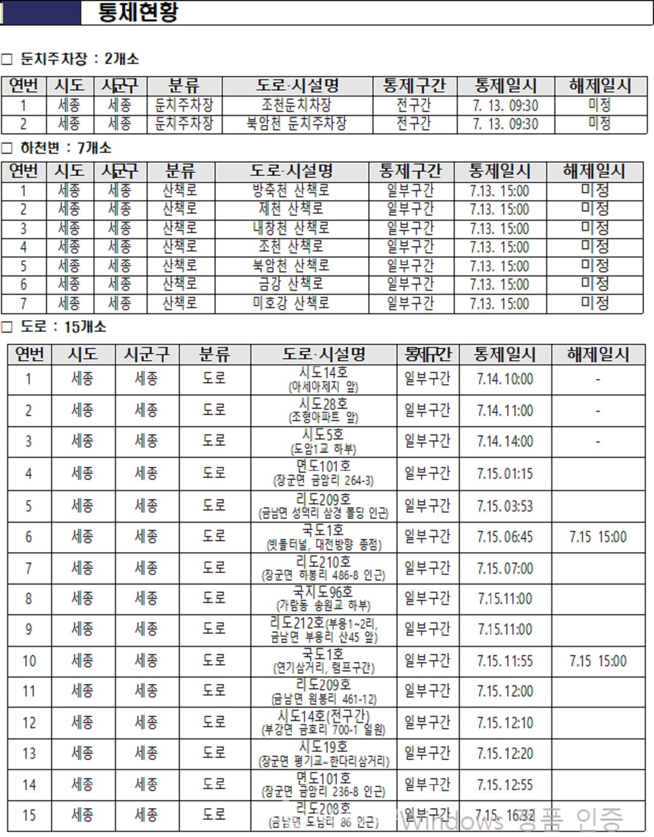 세종보도 종적 감춰...신도심 3대 하천, 조치원 조천 등 통행 제한