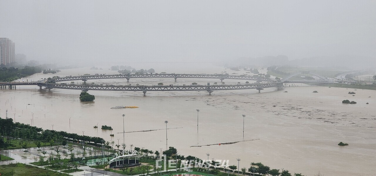 금강 수위가 수변 보행‧자전거 도로를 완전히 잠식한 데 이어, 현재는 지난해 3월 개통한 이응다리 접속교 턱밑까지 차오르고 있다.