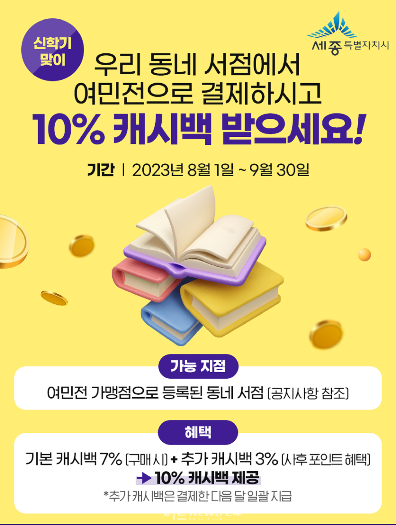 여민전 사용이 가능한 지역 서점 29개소를 이용하면, 이용 즉시 7%에다 다음 캐시백 3%를 추가 지급한다.