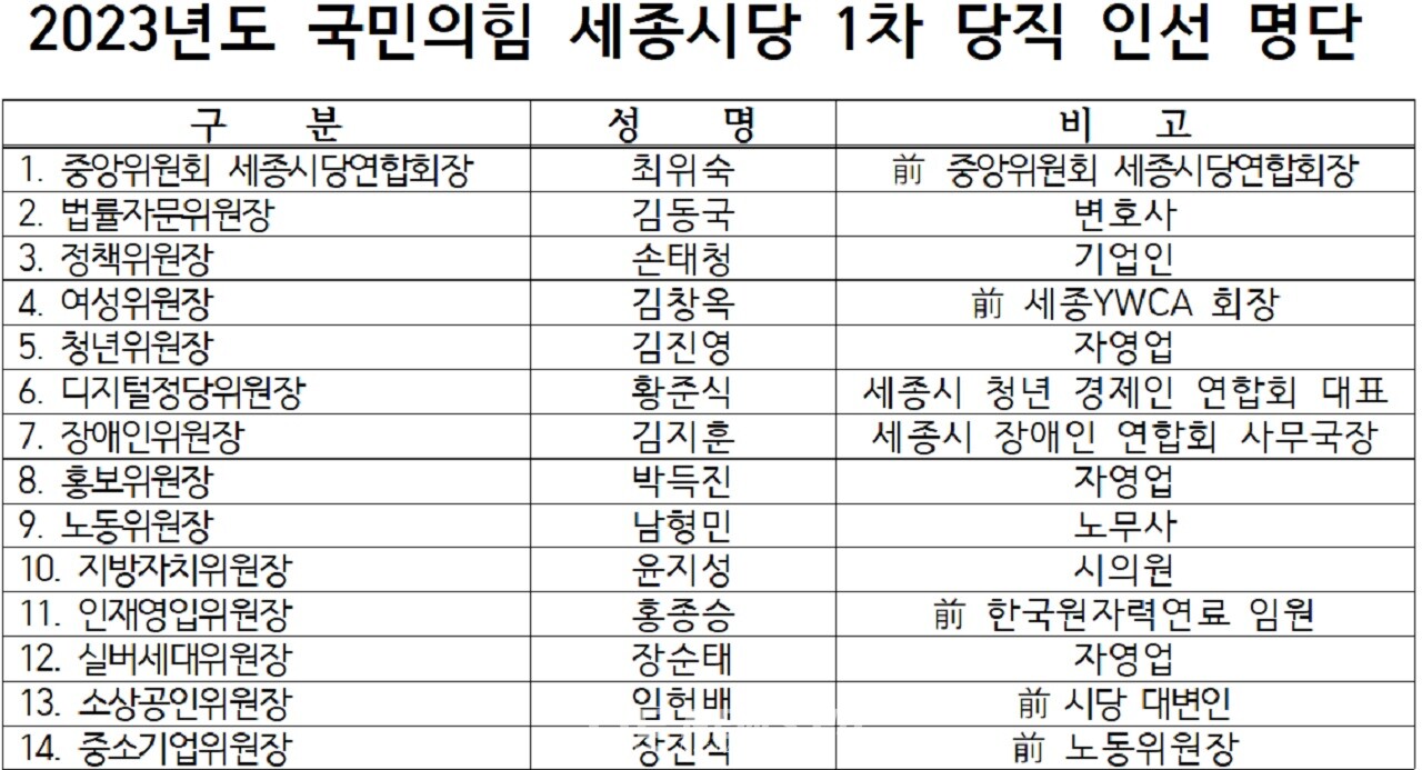국민의힘은 이날 류제화 갑구 조직위원장 임명에 맞춰 세종시당 주요 당직자 인선을 통해 조직 전열을 재정비했다.