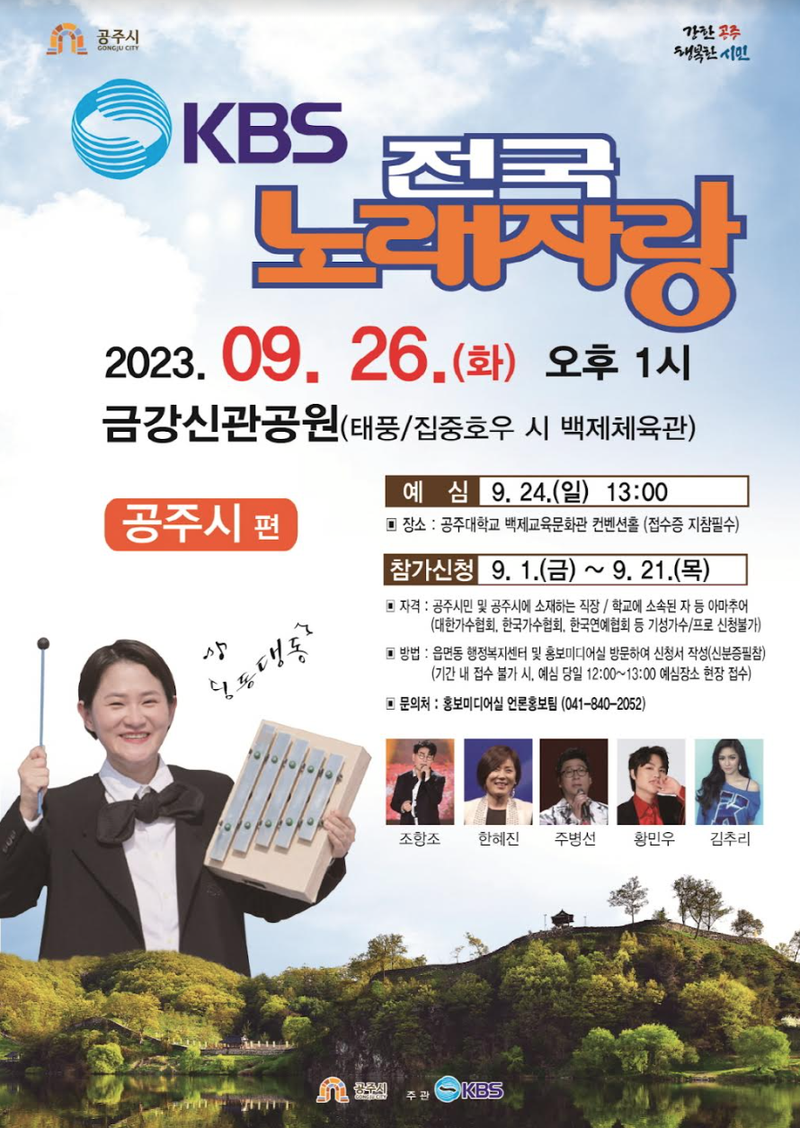 26일 오후 1시 금강신관공원 무대에서 개최되는 전국노래자랑은 24일 오후 1시 백제교육문화관 컨벤션홀에서 예심을 거친다. 오는 21일까지 참가자 신청을 받는다.