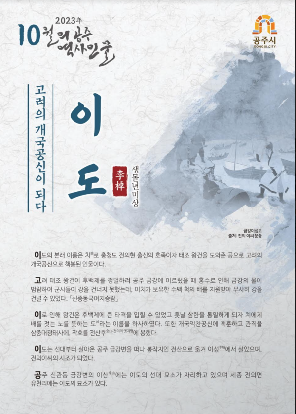 조병철 문화재과장은 “공주 금강을 터전으로 하여 고려의 개국공신이 되었던 이도의 업적을 기리기 위해 10월의 역사인물로 선정했다”라며 “10월 중 시민을 대상으로 관련 행사를 개최할 예정”이라고 말했다.