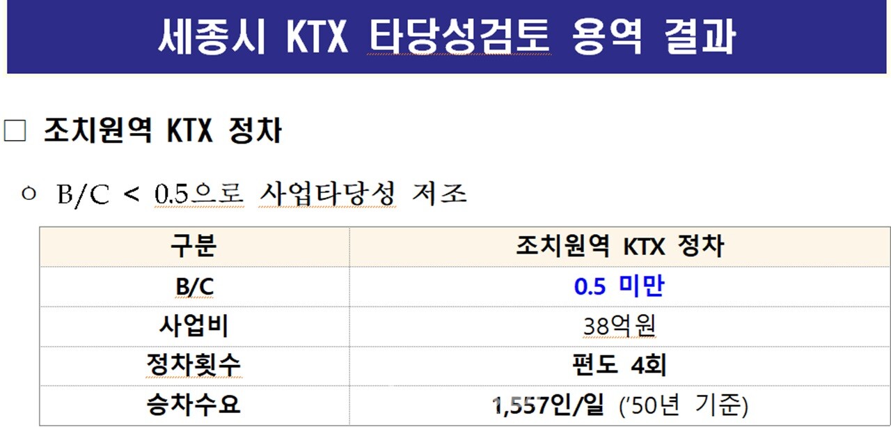 최민호 시장이 공약으로 제시할 당시부터 쉽지 않은 과제로 꼽힌 '조치원역 KTX 정차'는 사실상 무산됐다. 일단 B/C가 0.5 미만에 머물렀다