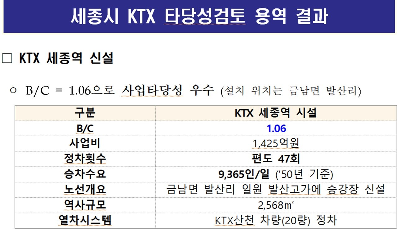 지난 2월부터 진행, KTX 세종역 B/C 1.06 경제적 타당성 확보