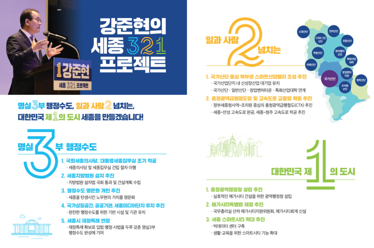 그가 제시한 '321'이란 숫자는 '명실3부 행정수도, 일과 사람2 넘치는 대한민국 제1의 도시 세종을 만들겠다"는 뜻이 담겼다. 수도권의 아성을 넘보는 대한민국 대표 도시로 만들겠다는 의지다.