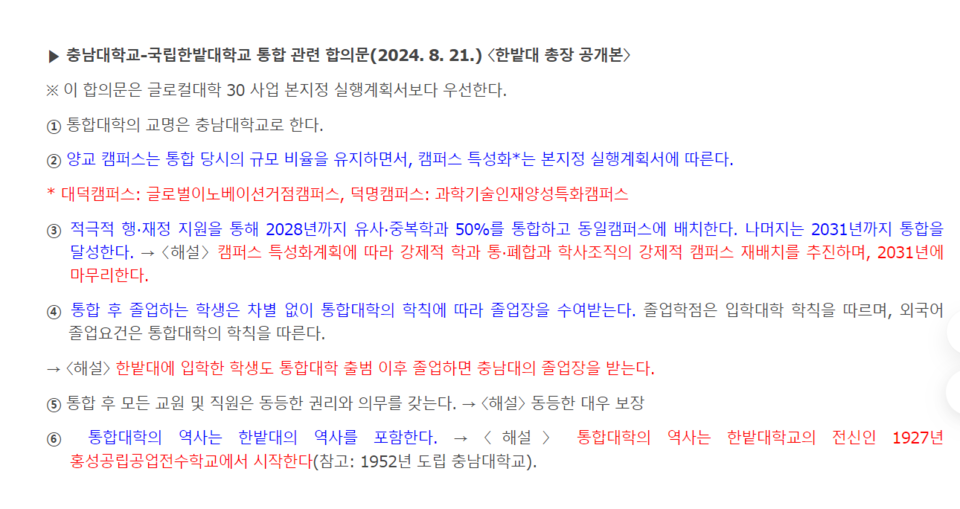 하지만 한밭대와의 통합 합의문 주요 내용은 김 총장의 약속과 다르게 해석될 여지가 충분, 구성원들의 반발을 불러 일으키고 있는 것이다.