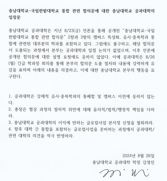 충남대학교 공과대학이 26일 긴급 학과장 회의를 열고 한밭대학교와의 통합 합의문 도출 절차와 내용에 강력한 유감을 표명했다. 또 강제적 유사·중복학과의 통폐합 및 캠퍼스 이전에 응하지 않기로 결정했다.