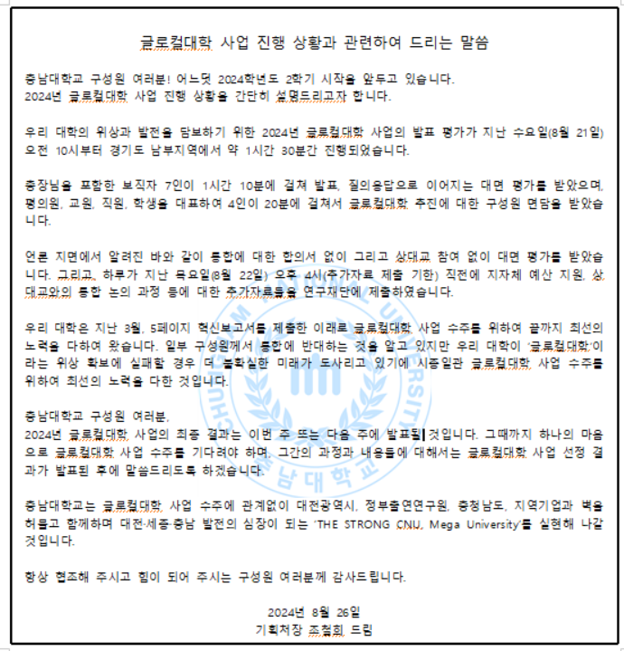 한편, 조철희 충남대 기획처장은 같은 날 오후 구성원에게 보내는 메일을 통해 "일부 구성원이 통합에 반대하는 것을 알고 있지만 우리 대학이 글로컬대학이라는 위상 확보에 실패할 경우 더 불확실한 미래가 도사리고 있기에 시종일관 글로컬 대학 사업 수주를 위해 최선의 노력을 다했다"고 밝혔다.