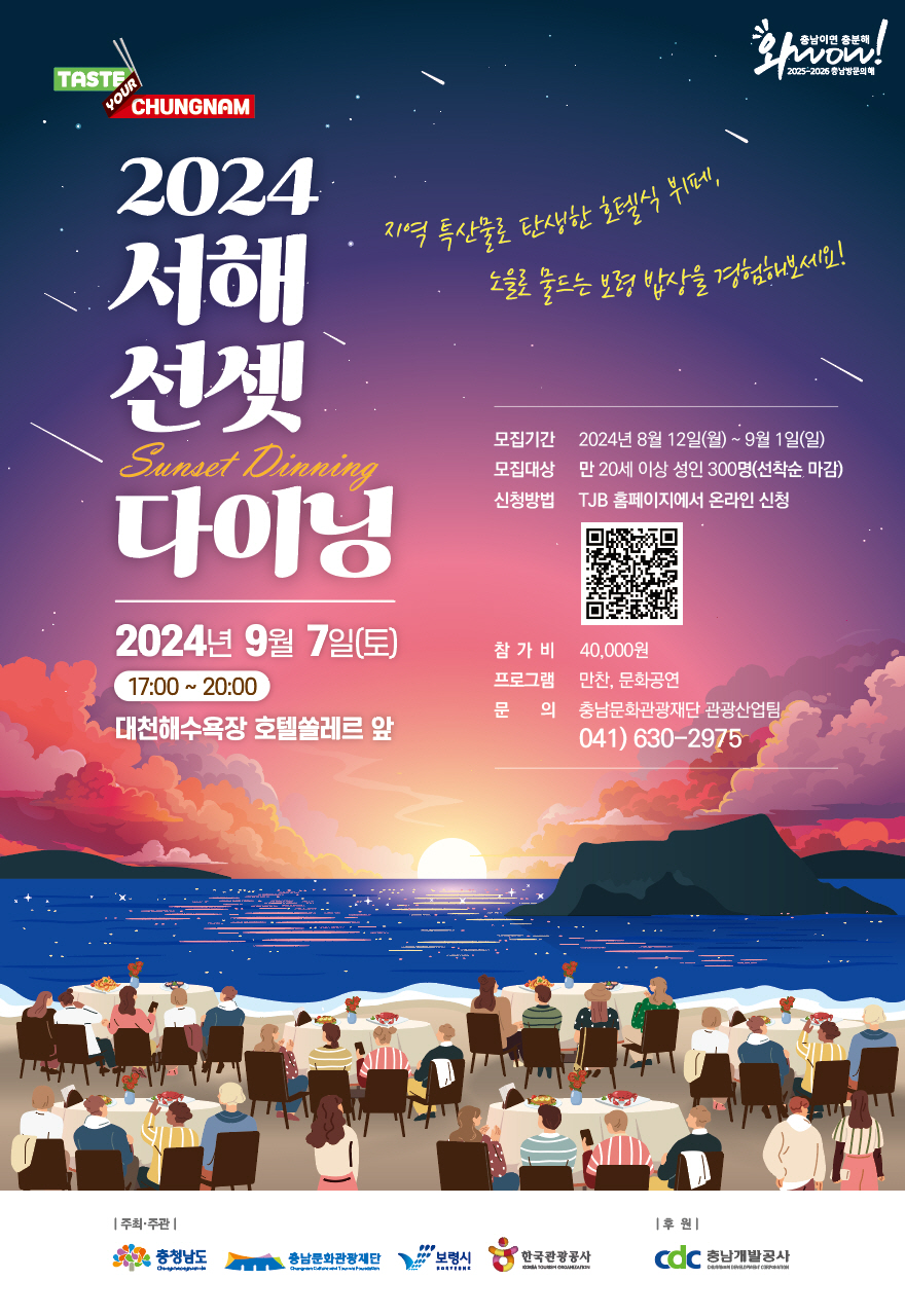 충남도는 오는 7일 보령 대천해수욕장 머드광장 일원에서 ‘Taste your 충남, 2024 서해 선셋 다이닝’ 행사를 개최한다.