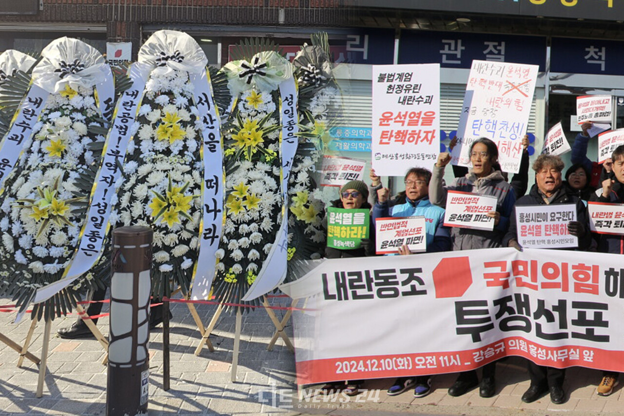 이날 오전 강승규·장동혁·성일종 의원 지역 사무실에는 근조화환이 배달되고, 시위가 이어졌다. 성 의원 서산지역 사무실 앞에는 ‘내란동조 성일종’ ‘서산시민이 심판한다’는 내용이 적힌 근조화환이 자리했다.