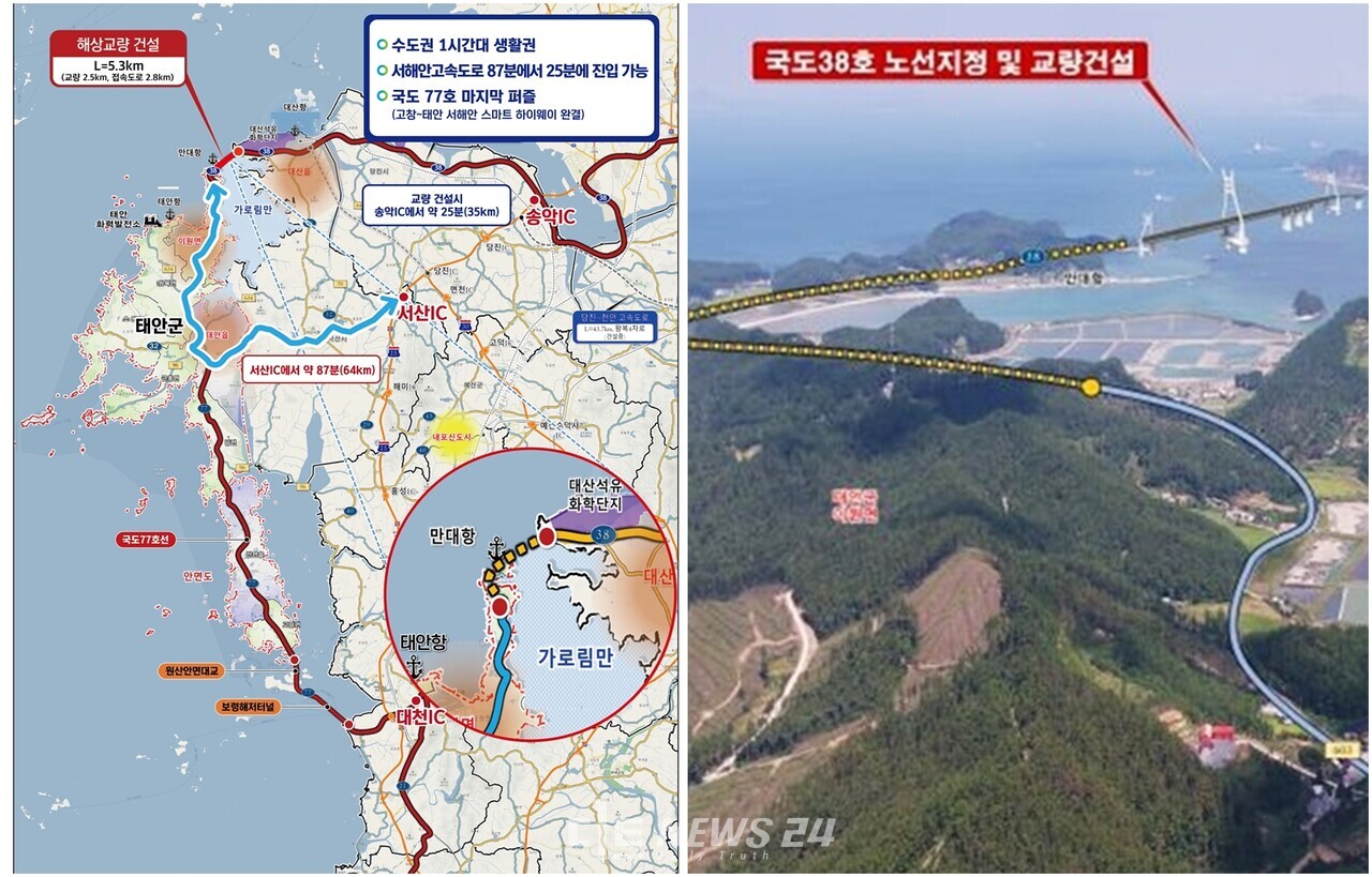 23일 정부가 발표한 제6차 국도·국지도 건설계획(2026~2030)에 국도 38호선 가로림만 해상교량 건설사업이 예비타당성조사 사업에 포함됐다.