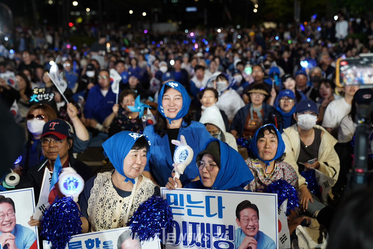 여의도 아스팔트에 앉은 시민들은 이 후보 발언이 끝날때마다 이재명을 연호했다.