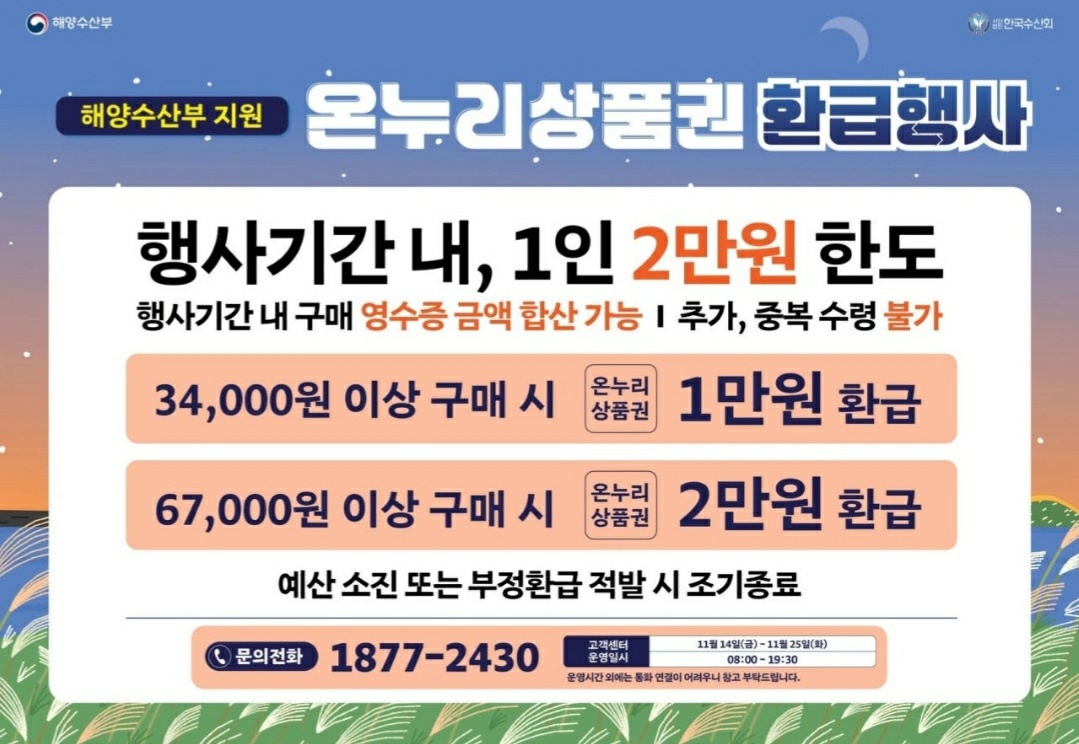 수산물을 구매한 소비자 대상으로 구매 금액의 최대 30%를 온누리상품권으로 환급하며, 환급 한도는 행사 기간 내 1인 2만 원으로 3만 4000원 이상 구매 시 1만 원, 6만 7000원 이상 구매 시 2만 원을 온누리상품권으로 환급받을 수 있다.
