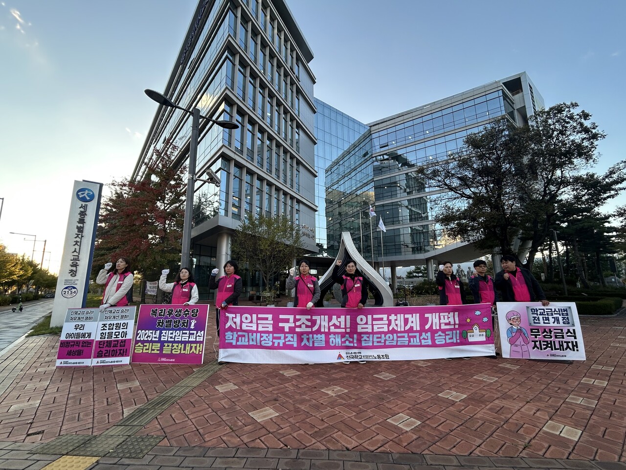 학비노조 세종지부 강현옥 지부장은 "우리 노동자들이 멈추면 학교가 멈춘다는 절박한 심정으로 거리로 나선다"며, "아이들의 급식, 돌봄, 행정 등 학교 운영의 핵심을 담당하는 우리에게 정당한 임금과 처우 개선을 약속할 때까지 투쟁을 멈추지 않을 것"이라고 했다.