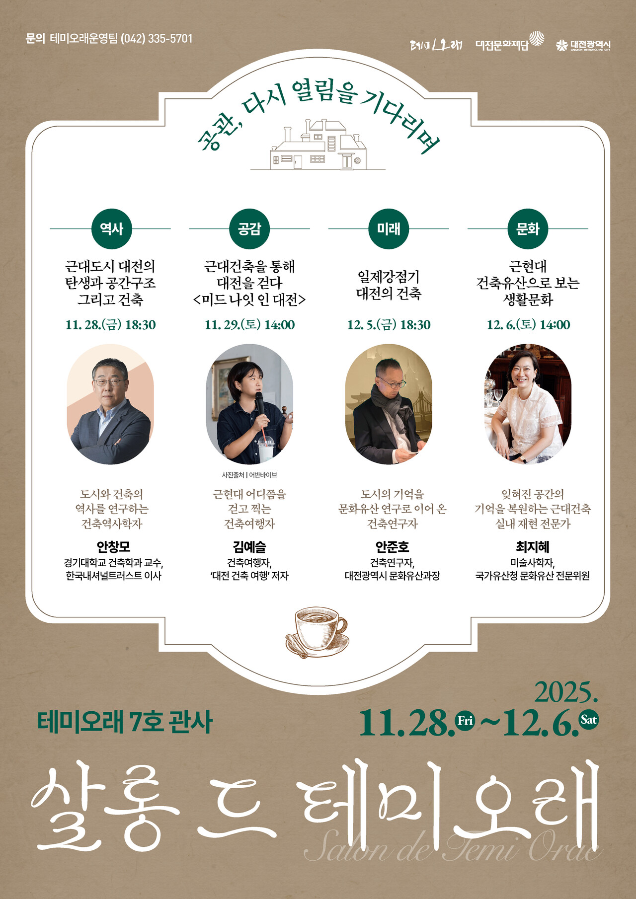백춘희 대전문화재단 대표이사는 “테미오래는 대전의 대표적인 근대건축유산이자 시민들의 복합문화공간”이라며, “이번 강연 프로그램을 통해 대전이 품은 근현대 문화유산의 가치와 도시의 미래를 함께 논의해 보는 자리가 되길 바란다”고 말했다.